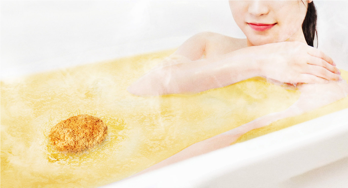 湯船に入れると、油で揚げているように見えるコロッケ型の固形入浴剤ケース。熱々のお湯に浸かっているような感覚でお風呂を楽しめる。