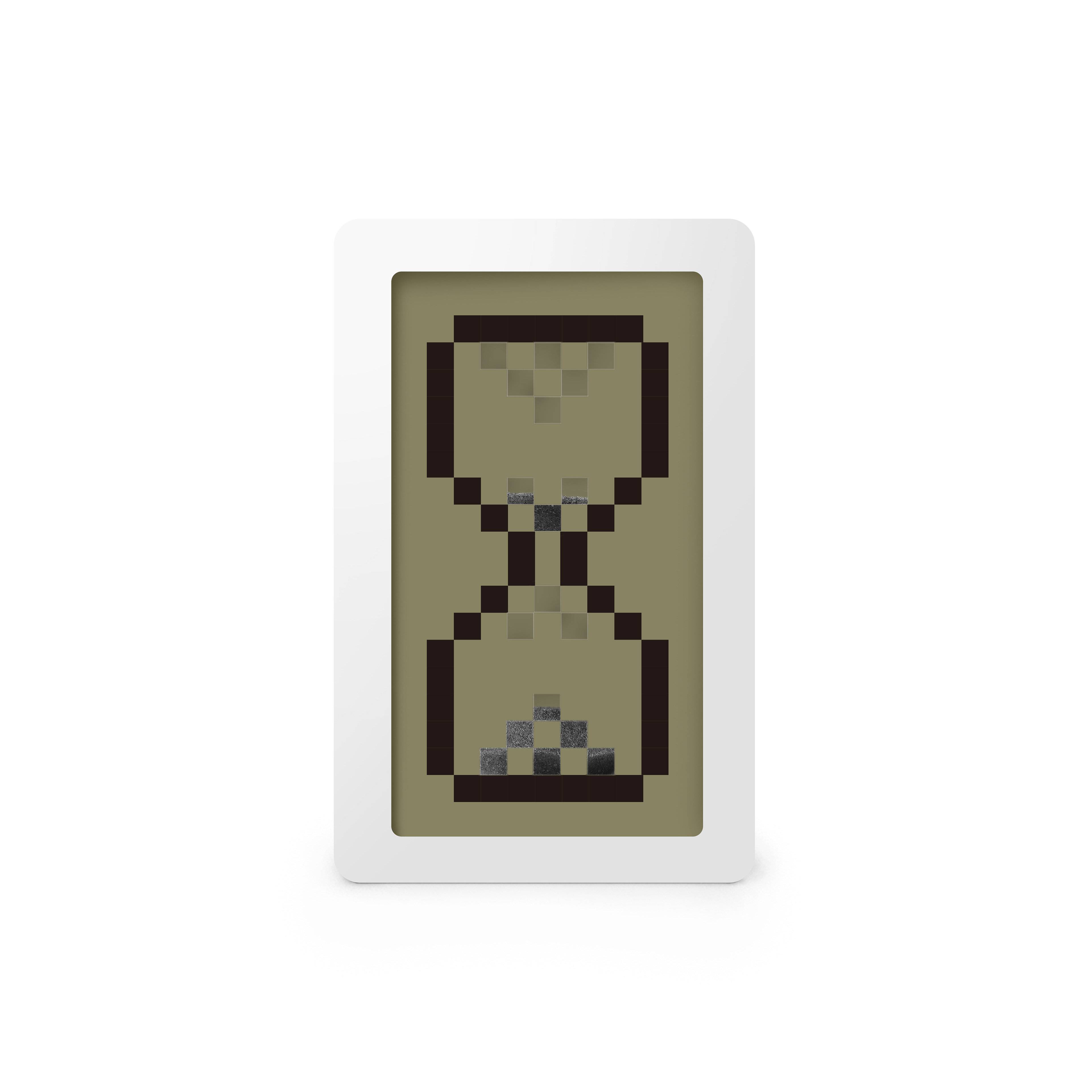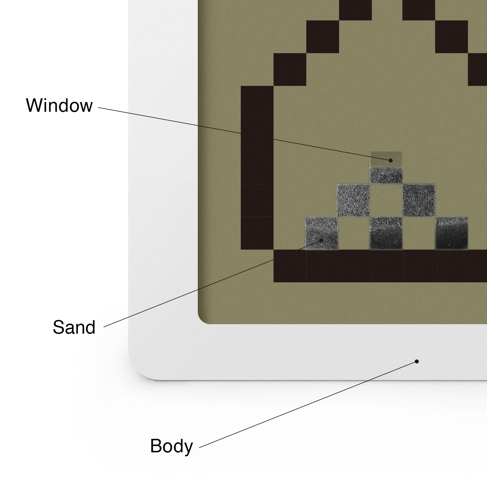 アナログな方法で切り替わるデジタル表示の砂時計。ドット絵の砂部分が窓になっているため、砂時計の中の黒い砂が時間とともに積もることで、ドット絵の砂時計が動いているように見える。